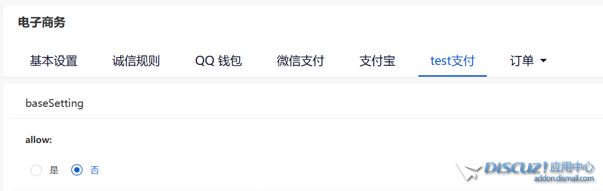 复制代码 同时,我们还为自定义支付通道的插件提供了,直接嵌入后台的入口,添加 admin/payment/payment_test.php 文件接口把你增加的支付方式的设置内嵌在后台和系统的设置项放在一起