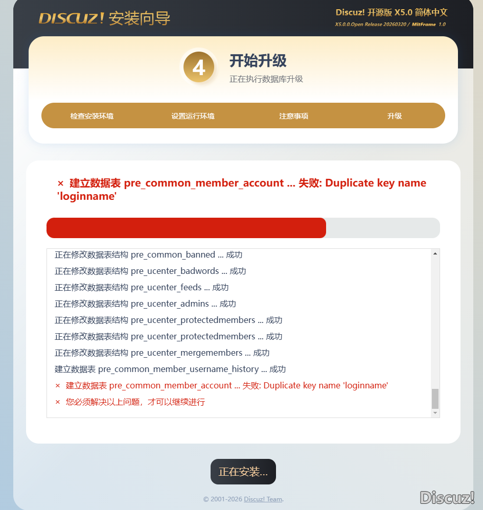 3.5版本升级到5.0版本的时候提示建立数据表失败 |